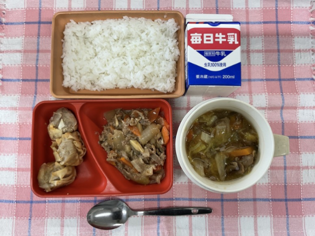 しゅうまい、チンジャオロース、八宝菜、ご飯、牛乳