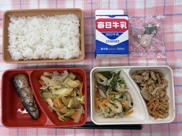 いわしの生姜煮、野菜炒め、菜の花のからし和え、ちらし寿司の具、三色団子、ご飯、牛乳