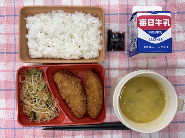 白身魚のフライ、春雨の炒め物、中華コーンスープ、ご飯、牛乳