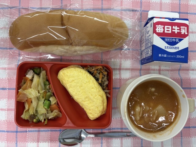 オムレツ、ごぼうソテー、アスパラの炒め物、ポークビーンズ、コッペパン、牛乳