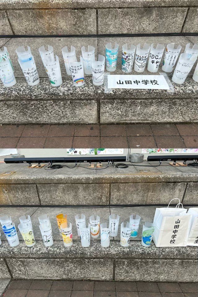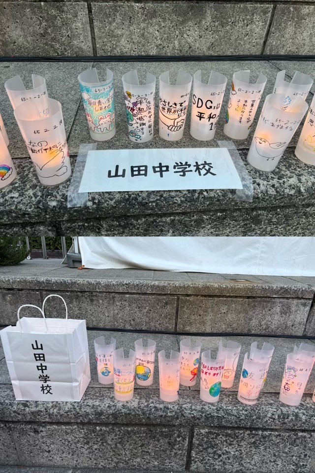 山田中学校の2年生も、平和へのメッセージを描いたキャンドルを作成して参加しました。