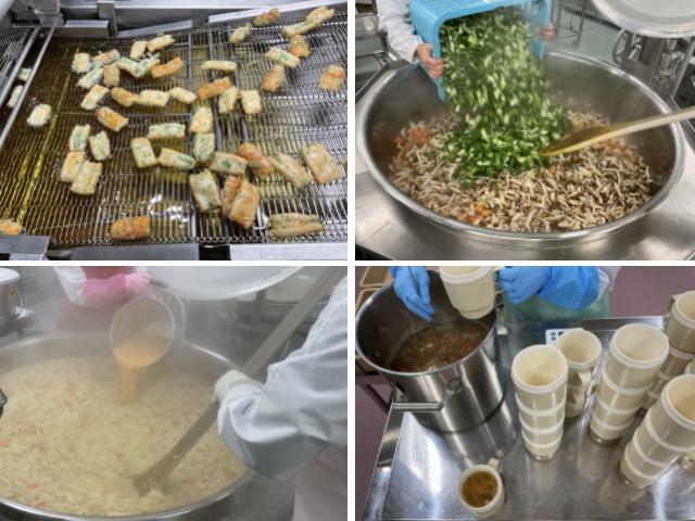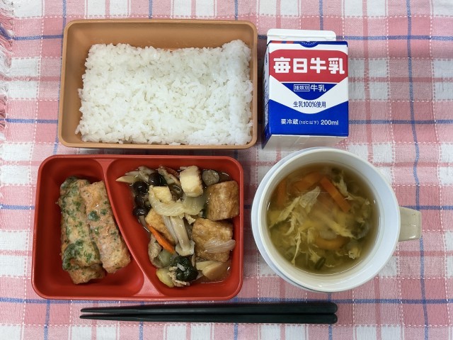 ちくわの磯辺揚げ、いかと厚揚げの野菜炒め、かきたま汁、ご飯、牛乳