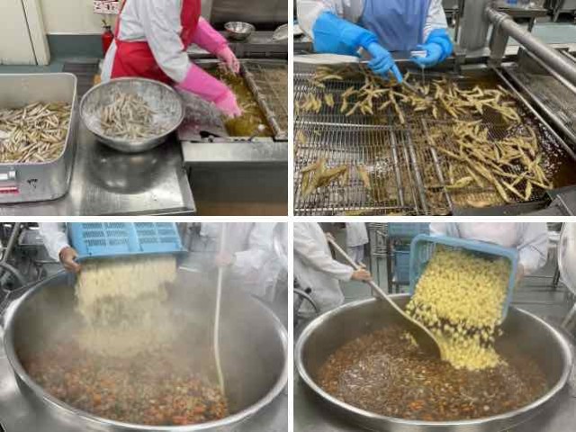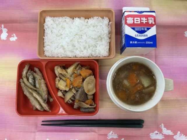 わかさぎのから揚げ、春たけのこの筑前煮、そぼろ煮、ご飯、牛乳