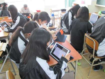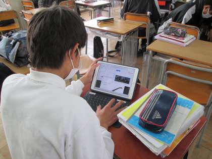2年2組は理科の授業でした。理科はタブレットを用いた調べ学習で、理科の教科書に出ている内容の中から、自分がさらに学習を進めたいと思う内容についてテーマを決め、調べ学習を行った後、パワーポイントで発表する資料を作成するという授業でした。取り組む内容が同じになった人は、希望に応じてグループで取り組むことも可能となっています。数名が集まっている写真は、グループで取り組んでいるところです。