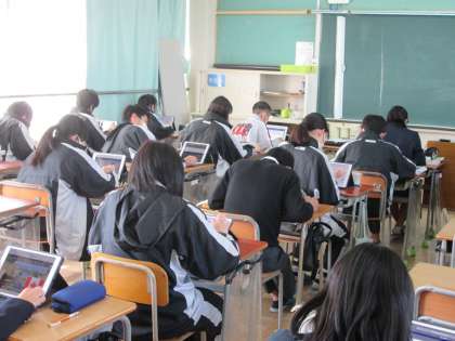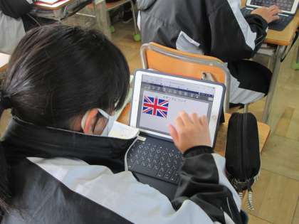 1年3組は社会の授業でした。社会の授業でタブレットを使っているのを見るのは、久しぶりでした。社会の課題は、自分の好きな国の調べ学習でした。但し、調べる内容について課題が出されているだけでなく、紹介するページの作成もしなければならないようです。大変そうですが、生徒は活き活きと取り組んでいました。