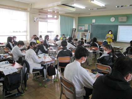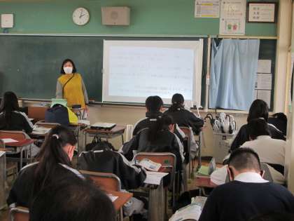 1年2組は社会の授業を教室で行っていました。撮影する少し前までは、動画を映していましたが、撮影時にはプリントの画像になっていました。学年末の5時間目なので気が緩んでいる生徒もいますが、全体的には真面目に授業を受けていました。