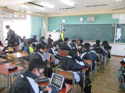 1組は国語、2組は理科、3組は社会の教科でしたが、1年生も2年生も今年度のカリキュラムがすべて終了したので、残った授業時間で、タブレットを使って調べ学習やカリキュラムにない生徒の自由度の高い課題を提供することによって、生徒の主体性を高める授業に取り組んでいます。本当はこのような授業をメインにして、生徒自身が求めるものを中心にした自由度の高い授業が教科教育に変わる授業として展開できれば、本当の意味で主体性を育てる、生徒主体の授業となるのですが…。まだまだ日本の教育の意識はそこまでいきそうにないですね…。