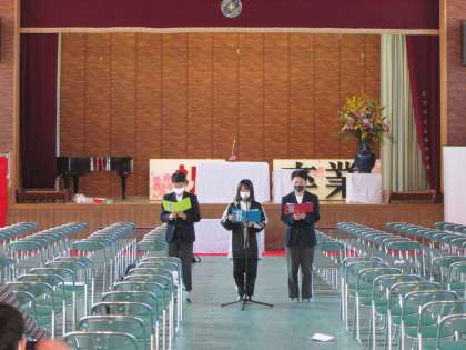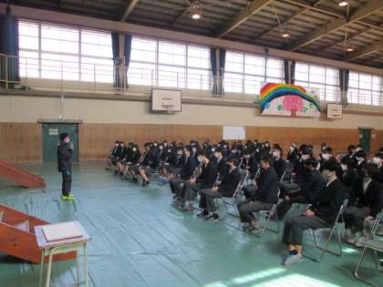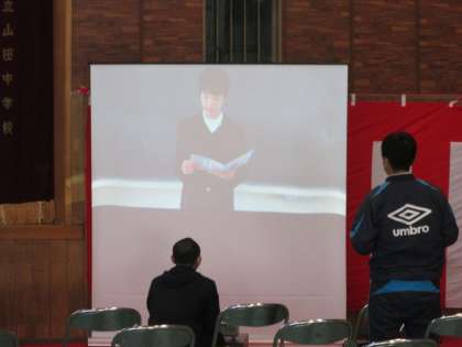 卒業式予行の続き写真です。このページは、予行終了後に学年主任の先生から明日に向けての心構えについての話がありましたが、その時の様子です。2枚目の写真は、予行の時は卒業の言葉を読みませんでしたが、後刻、実際に読む練習を行いました。その読む練習をしているところの写真です。3枚目は、2年生の生徒会長からの送辞のビデオです。在校生は出席できないので、事前にビデオで撮影して、それを式のときに前に映写する予定です。