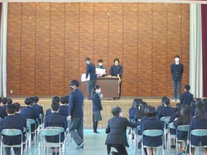 本日、2・3時間目は、3年生が卒業式の予行を行いました。今年度はコロナ禍の為に在校生は卒業式に出られないため、3年生のみの予行となりました。予行の様子は、私も予行に参加しているために撮影できませんでしたので、予行の前後の練習の様子などを撮影しています。概ねこんな感じということでご覧ください。このページは卒業証書授与の場面です。