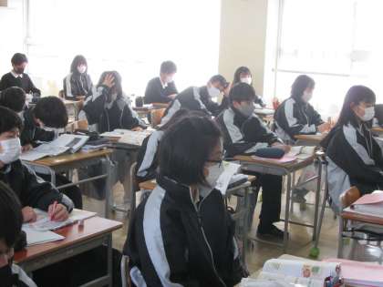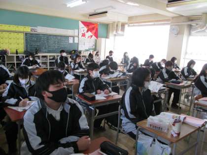 今日の3時間目の教室棟の授業は、1年1組と2年1組及び2組の3クラスだけでした。おそらく授業実施クラスがあまりにも少なかったために、違和感を感じるくらい静かだったのかもしれません。その静かすぎる2年1組の技術家庭科の授業の様子です。