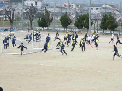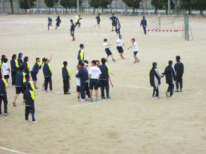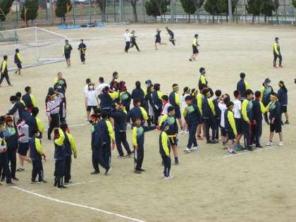 1年生の学園行事はドッジボールに続いて、警察とドロボーをしました。こちらはクラス対抗でしたが、写真ではどうなっているのかわかりにくいと思いますが、写真ではこれが限界ですので、取り敢えずどんな感じのモノなのかだけご覧ください。円陣になっているのは、クラスごとにゲームを始める前に士気を高めるためのものです。またサッカーゴールは障害物として置かれています。