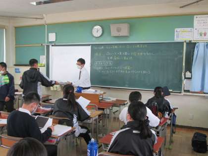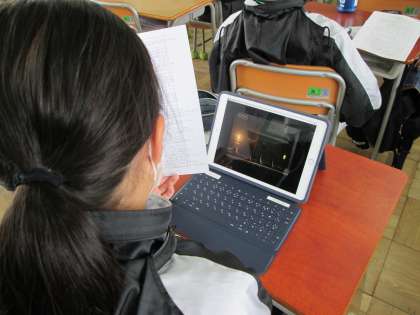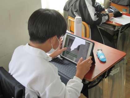 1年3組は理科の授業で、撮影時は、タブレットを使って調べ学習の発表作品(パワーポイントで作ったデータ)をみて、各自が採点するところの最後の時間帯でした。前半は凸レンズの復習で、これもタブレット(ミライシード)を使って問題を解いていたようです。