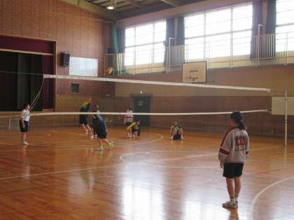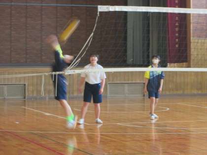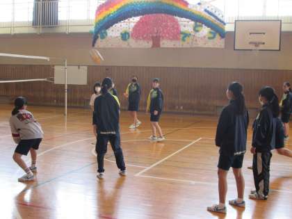 1年1組の女子の体育の様子その2です。まだサーブができないので、サーブの代わりにボールを投げて試合を進めています。