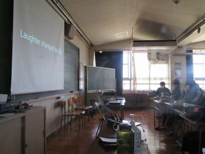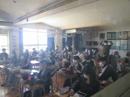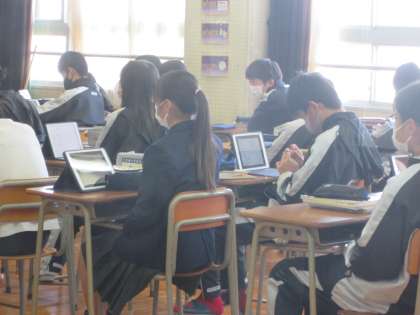 2年3組は英語の授業でした。ター先生と井上先生の授業でした。いつもなら教室にさっと入れる活気あふれる授業ですが、今日はしーんとしていて、とても教室のドアを開けて入れる雰囲気ではなかったので、ドア越しに撮影しました。有名人の物語を英語の説明による映像を流していましたが、みんなすごく真剣に見聞きしていました。こんなにみんなが一心に集中している場面は、英語の授業らしくない感じでした。