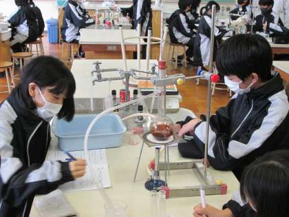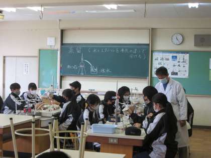 本日3時間目、2年1組は理科室で実験をしていました。先日他のクラスでも取り組んでいましたが、ワインを使った蒸留の実験でした。