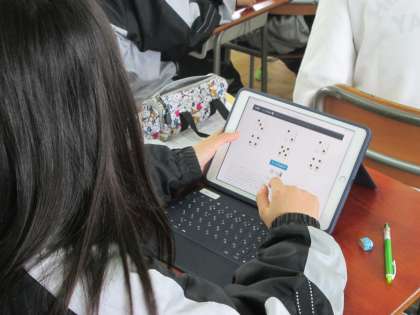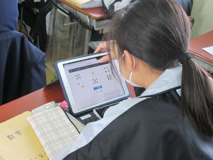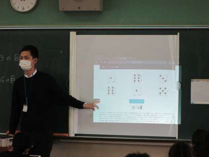 本日3時間目の1年2組の数学の授業です。確立の課題をタブレットのサイコロの機能を使って取り組んでいました。最初は個人でカウントし、後半は班になってよりたくさんのデータを収集するようになっていました。タブレットを忘れた人は、実物のサイコロで出る目の数をカウントしていました。