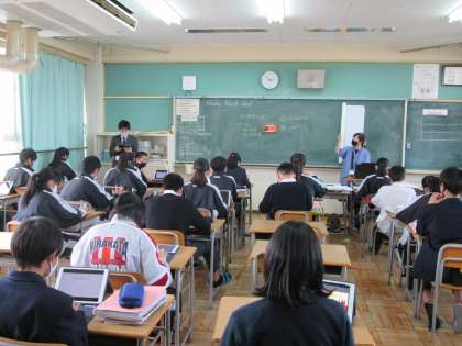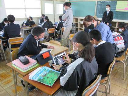 本日6時間目に英語科で校内研究授業を実施しました。実施クラスは1年3組で、山田中学校の教員だけでなく、他校からも授業観察に先生が来られました。私は出張があったために授業の後半少ししか見に行くことができなかったのですが、後半はタブレットを使って、自分の好きなものに関して英語でプレゼンテーションをする取組で、発表時に使う画像を5ページ作成する取組をしていました。今日が学年最後の英語の授業で、完成していないところは春休みの宿題となります。