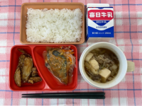 豚肉の生姜焼き、ボイル野菜(もやし)、じゃがいものマヨネーズ炒め、春雨入りかきたま汁、ジョア(いちご)