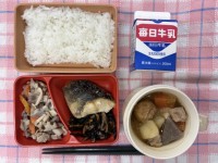 ホキの甘辛揚げ、きのこの炒め物、里芋のそぼろ煮、すまし汁