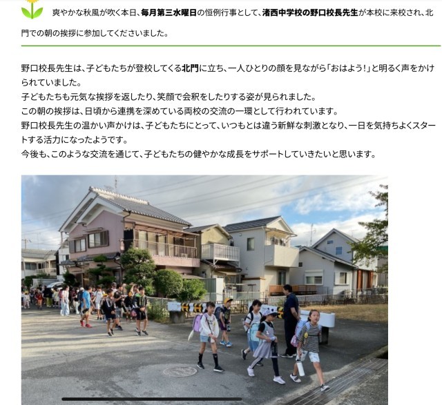 校区小学校の様子を伺うことだけでなく、小学校の児童が中学校に入学する時に、少しでも安心して入学できる材料になること、そして、校区の子どもたちは、地域と連携し校区の小中学校教職員で育ててくことを意識することで子どもたちを見守る小中のつながりや連携を深めていくことを目的にしています。渚西中学校区では、これからも小中の人と人とのつながりを大切にしていきたいと思います。