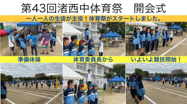 今年度の渚西中学校 体育祭のスローガンは、「有終の美~我らの花が咲く~」。生徒の皆さんで本当に素晴らしいスローガンを掲げてくれました。スローガンにある「有終の美」には、文化祭から続いている学校行事の締めくくり。そして3年生が中心になって1年間取り組んできた渚西中学校の区切りとなるこの体育祭が、まさに「有終の美」となり、生徒一人一人の良さがあふれた素晴らしい花が咲き誇る、そんな渚西中学校でしかできない体育祭にしていこうという皆さんの思いが詰まったものです。