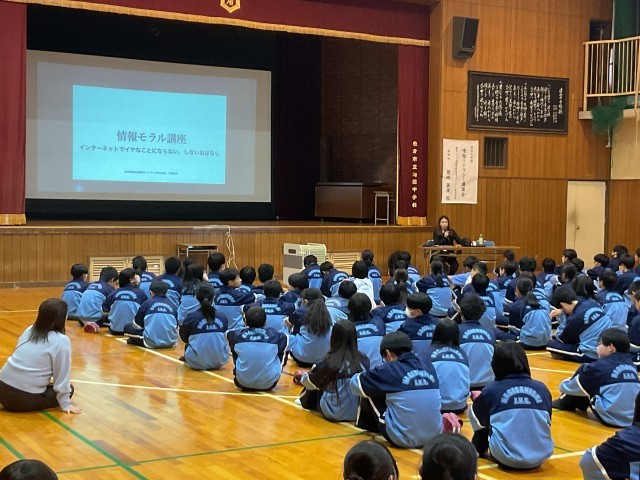 5時間目の授業参観後、6時間目に「情報リテラシー講演会」を行いました。講師には「NIT情報技術推進ネットワーク株式会社 筒崎様」をお招きし、参観後の保護者の皆様方にもご参加いただきました。スマートフォンの普及により、色々なことができるようになり大変便利な世の中になりました。一方で、SNSを通じて友達同士のトラブルだけでなく、学校を超えたトラブルや世代や地域を超えたトラブル、場合によっては犯罪に巻き込まれるような事案も報道されています。私たちは報道されているものしか知り得ないのですが、表面に出てこないものも含めるとかなり多くの事案が発生しており、生徒たちを取り巻く環境も使い方を誤ると大変危険な状態になっています。これまでとは違い、スマートフォンの中で進行し、気付きにくいトラブルや犯罪への入り口があり、周りの大人が見えないことでさらに危険な状況を増しているように感じます。
