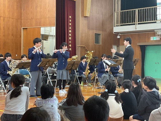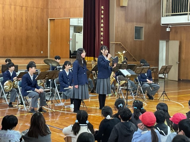 先週の金曜日に1・2年生は学年末テストが終了しましたが、その日の午後に校区の西牧野小学校からの要請を受け、小学校のお昼休みを利用し、本校吹奏楽部による演奏会を実施しました。当日は、午後からの授業参観に合わせ、保護者の方も参加いただき、参加してくれた子どもたちも大盛り上がりでした。このような機会が小学校の児童の目標や憧れにつながることを期待し、今後も続けていきたいと思います。
