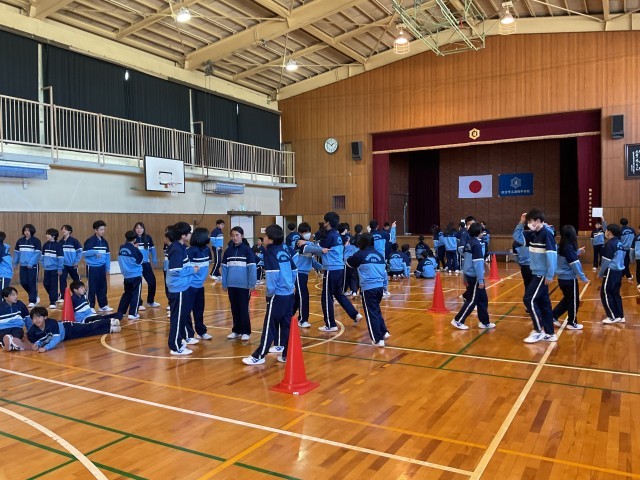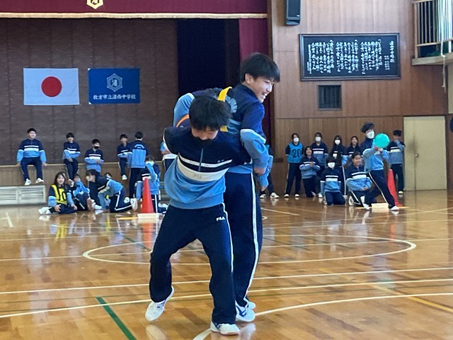 本日の5時間目に1年生は学年レクを行いました。係の生徒が中心となり進行をしましたが、大盛り上がりの1時間でした。クラス対抗のリレー?(走る前にカードを引き、そのカードの指示通り走る)も教科書を頭に乗せて走る生徒、風船を前に叩きながら走る生徒、フラフープを潜りながら走る生徒・・・様々なグッズを使用しリレーをしていました。最後の走者がゴールした時には全ての生徒が拍手を送り健闘を讃えあう姿が印象的でした。
