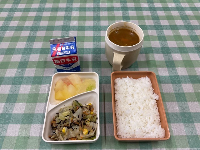 米粉ビーフカレー、ツナひじきサラダ、フルーツポンチ(りんご・梨)にご飯・牛乳でした。
