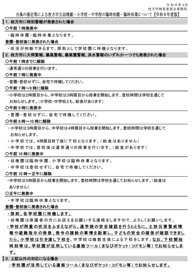 「台風の接近等による枚方市立幼稚園・小学校・中学校の臨時休園・臨時休業について」です。