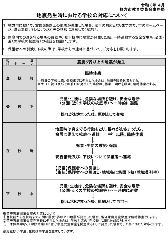 枚方市において震度5弱以上の地震が発生した場合の対応です。