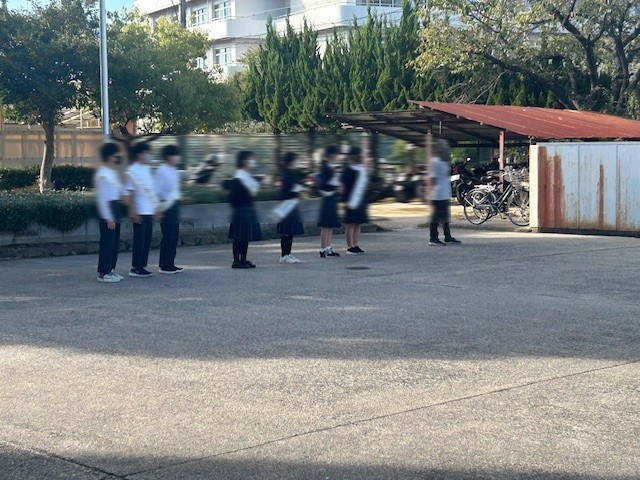 今日は各専門委員会の委員長に立候補している生徒たちです。手作りのたすきをかけ、登校してくる生徒に「おはようございます」と声をかけていました。立候補者に駆け寄り、激励する生徒もいました。