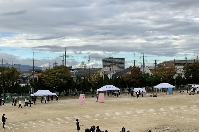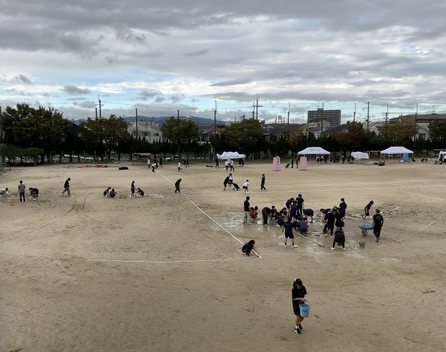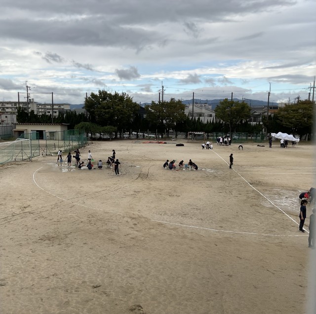昨日夜の雨の影響で、グラウンドには水たまりが多く残る中、明日の予行練習の準備に生徒会、体育委員、部活動の生徒たちが一生懸命に取り組んでくれています。