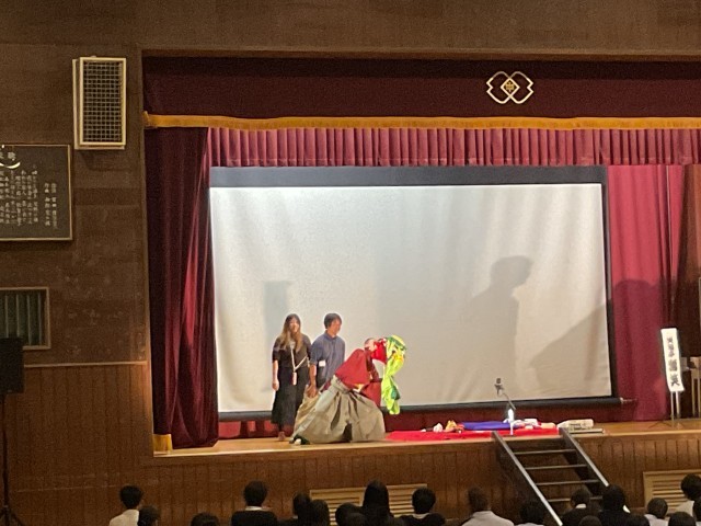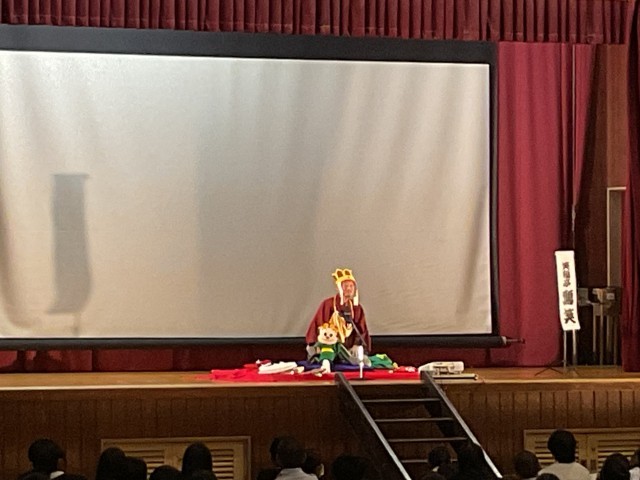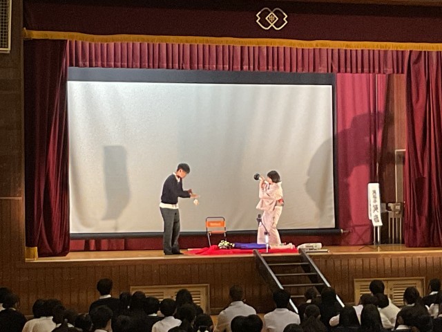 古典落語やパペットを用いた落語で生徒や教師も参加する場面もあり会場が笑いでいっぱいになりました。また、鶴笑さんが難民キャンプへ赴き、落語を通して励ましの笑顔を届ける活動の動画を視聴しました。