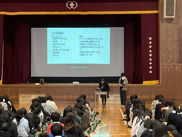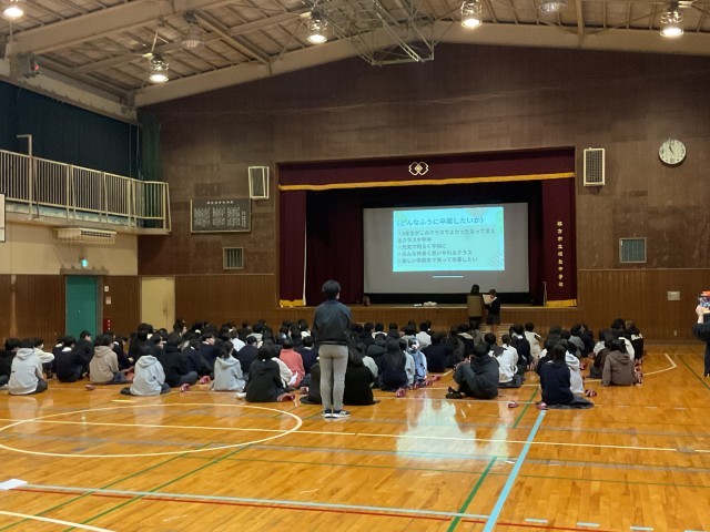 各クラスで2学期の良かったところ、課題となったところ事前に話し合い、3学期に向けての過ごし方やがんばろうと思うことなどについて学級代表がまとめて発表していました。