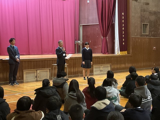 校歌斉唱、校長挨拶の後、部活動表彰でバレーボール部3年Y・Hさんが大阪北選抜女子として選出されていたジュニアオリンピックカップ第39回全国都道府県対抗中学バレーボール大会で全試合に主力メンバーとして活躍し、優勝に貢献したことを称えて、賞状と優勝メダルを授与しました。Y・Hさんは代表に選出されてから、授業終了後にチームの練習へ駆けつけるなど本当に頑張ってきました。その頑張りが報われて本当に良かったです。