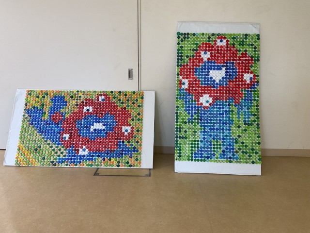 先週は、にじいろ学級の生徒たちがペットボトルのふたを利用して作成した「ミャクミャク」が枚方支援学校で展示されていました。