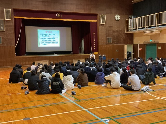 講師のドクターからの質問に生徒たちは積極的に答えながら、がんについてさまざまなお話を真剣に聴いていました。