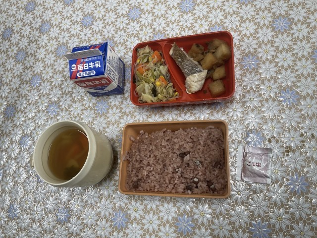 今日のメニューは、鯛の塩焼き、揚げじゃがいものネギだれ、小松菜とツナの炒め物、お祝いすまし、ごま塩、赤飯、牛乳です。