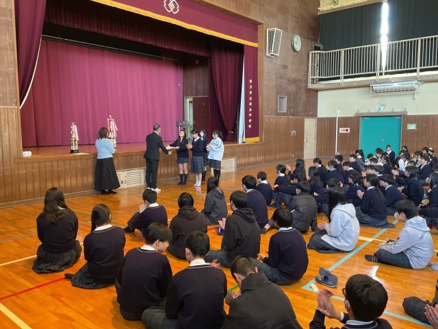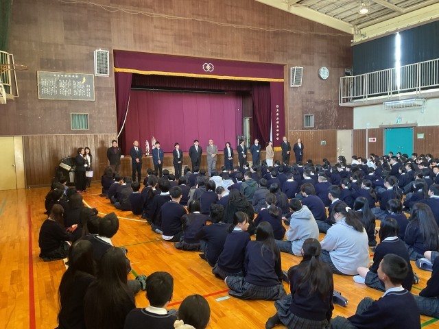 昨年度末でこの桜丘中学校を去られた先生方の紹介と4月から桜丘中学校に着任した先生が生徒たちの前に立ち教頭先生から紹介がありました。すべての先生たちに対して生徒たちが拍手をして歓迎してくれていました。
