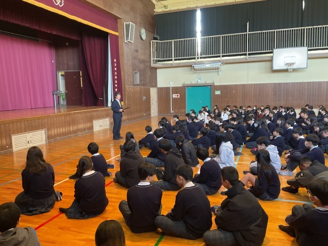 校歌斉唱後、校長の始業式の話にも顔をあげ、視線を向けてしっかりと聴いてくれていました。生徒指導主事も「みんなが毎日学校に行きたい」と思える学校にとの想いを生徒たちに話してくれました。