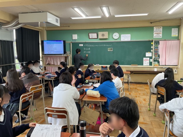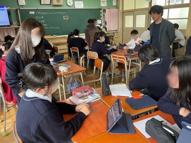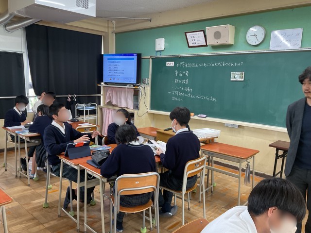 授業者から、班で共有して理解した「帝国主義」「欧化政策」「ノルマントン号事件」を使い、『不平等条約の改正につながるまでの流れを説明しなさい。』というお題が出され、班員同士で話し合ったり、また他の班に情報を求めている生徒もいて活発に議論していました。AIを利用して模範解答を調べる班もありました。授業者からは、この問題は、東京大学の入学試験に出されたものと説明があり生徒も驚いていましたが、与えられた課題に真剣に取り組んでいる生徒は素晴らしかったです。語句だけを覚えるのではなく、全体を捉えたり、流れを理解した上で、自分で学習したことを他の人に説明できることが本当の意味で自分の知識として定着すると感じました。