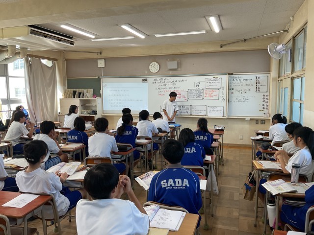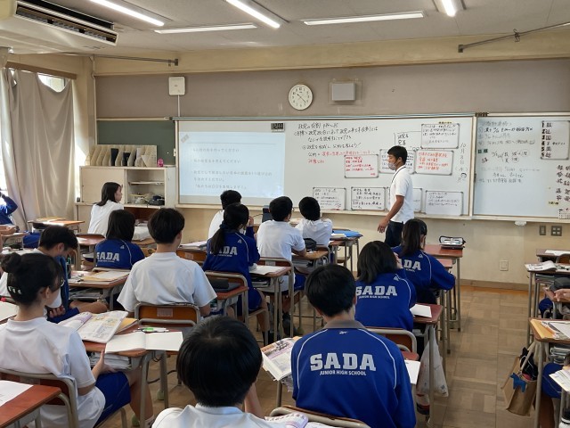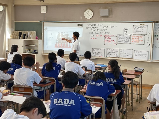 政党の役割について学んでいました。各班で政党名、党首、公約やその理由について考え、発表していました。