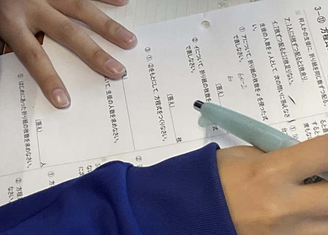 方程式について問題を解いている様子です。班でわからないところは教え合いをしながら取り組んでいます。