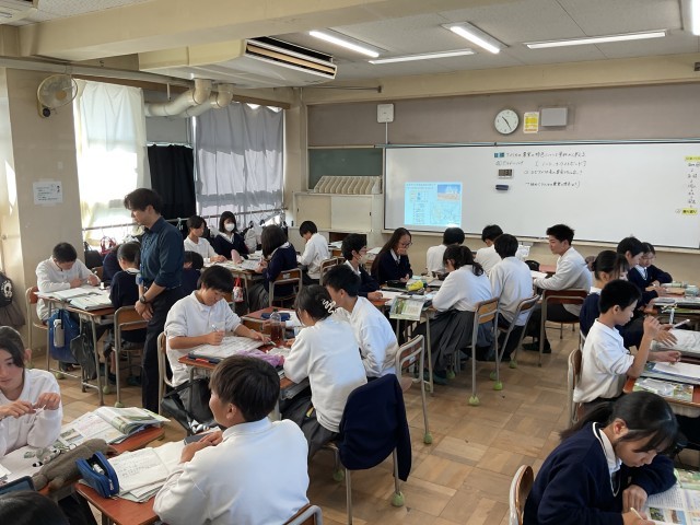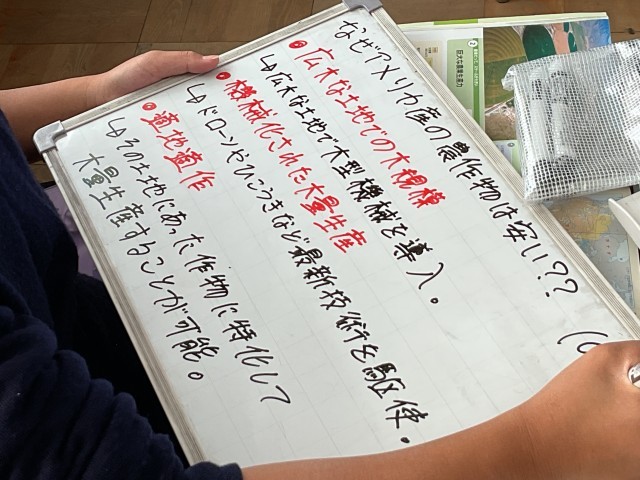 アメリカの農業の特色について、資料から読み取り、それぞれの班で交流後、全体で交流し学びを深めました。