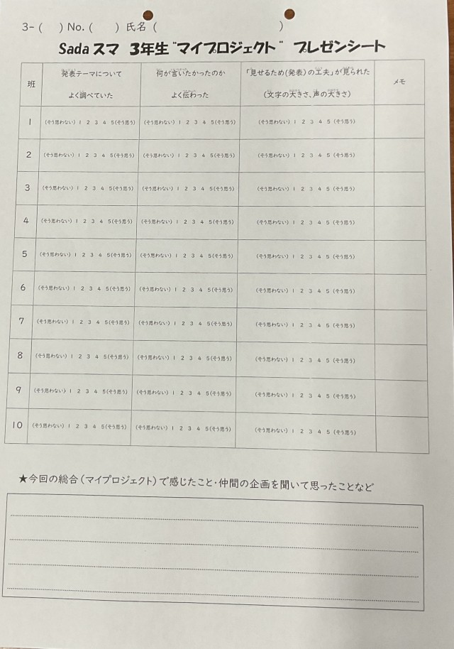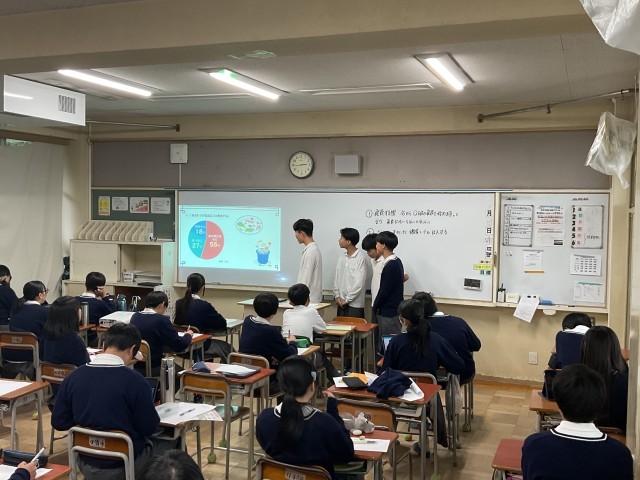 本日(11/5)6限目に3年生がマイプロジェクトのクラス発表を行いました。各クラスで選ばれた班が3年生の保護者集会の時に発表する予定になっています。