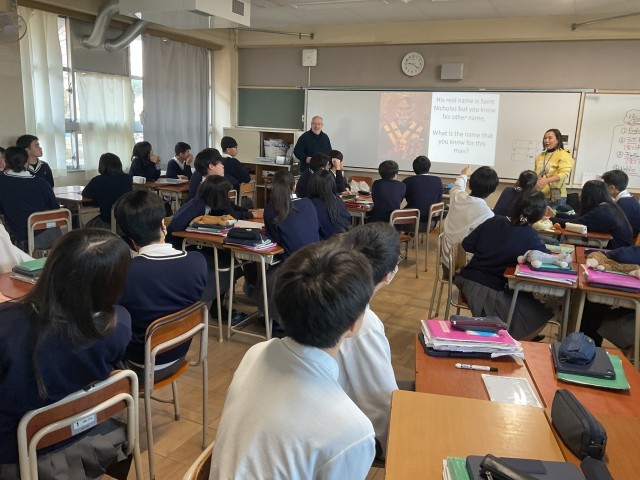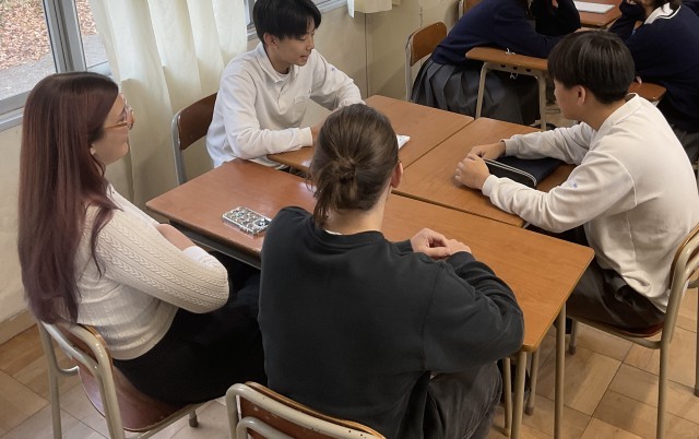 マイプロジェクトで交流した、関西外国語大学の留学生2名に来校していただき、交流を行いました。アメリカとイタリアからの留学生で、将来はNETをめざしている学生でした。