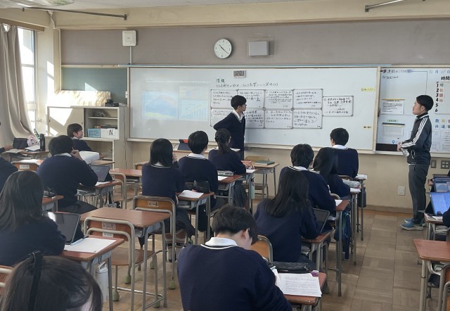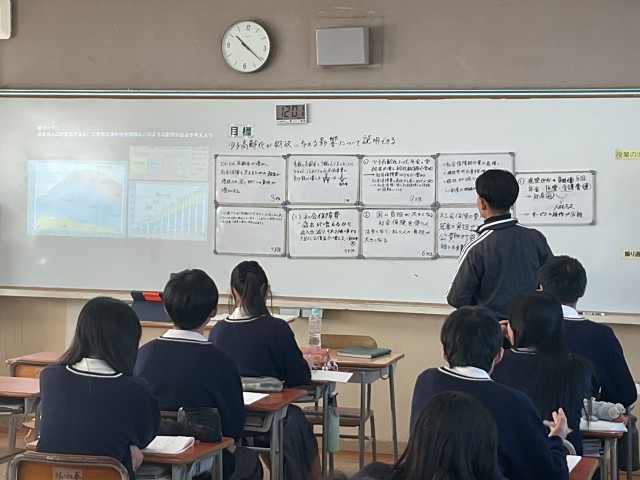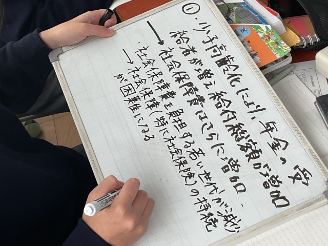 少子高齢化が財政に与える影響について班ごとに考え、その後全体で意見交流し、学びを深めました。