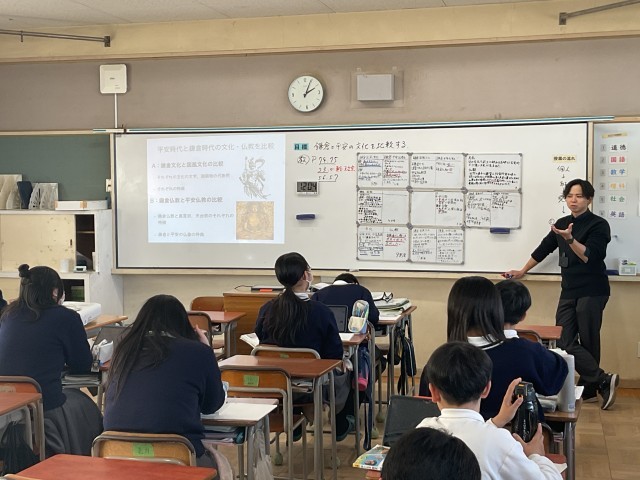 鎌倉と平安の文化について、班で交流をし、その後、全体で出た意見を確認していました。