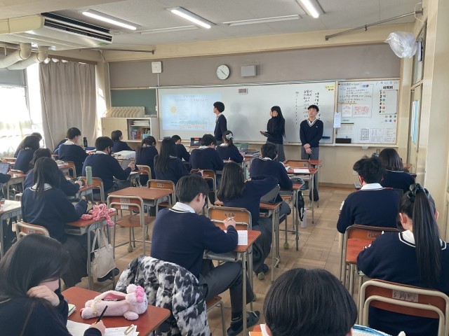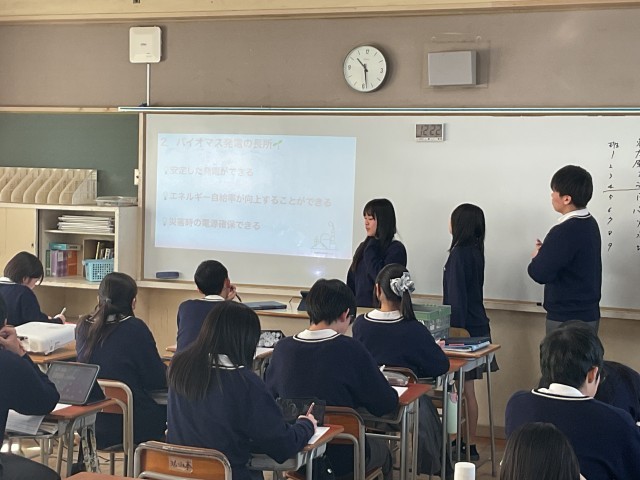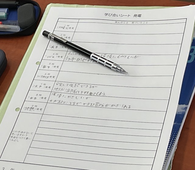 班ごとに発電(太陽光、原子力、波力、うどん、風力、バイオマス、火力、水力、地熱)について調べ、発表をしていました。